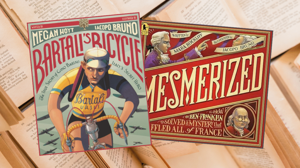 The threads can jump off the page, such as World War II in Italy with Gino Bartalli, or be hidden in the illustrations. For example I went down a serious costume rabbit trail after reading Mesmerized: How Ben Franklin solved a Mystery that Baffled All of France by Mara Rockliff, illustrated by Iacopo Bruno.